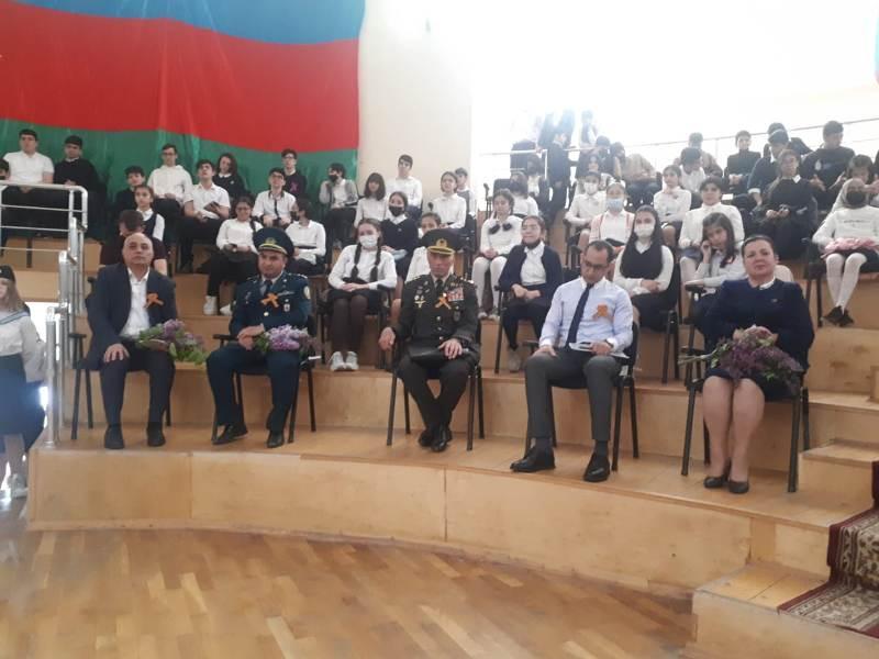 Şagirdlərin və müəllimlərin çıxışlarından sonra söz qonaqlara verilib. Adil Haqverdiyev çıxış edərək bildirib ki, xalqımızın İkinci Dünya müharibəsinin qələbə ilə başa çatmasında misilsiz xidmətləri olub: “ Müharibənin ilk günlərində vətəndaşlarımıza qarşı ədalətsiz davranışlar olmuşdur.Belə ki, rus dilini bilməmələri səbəbi ilə verilən əmri düzgün yerinə yetirə bilmədikləri üçün vətəndaşlarımız rus zabitləri tərəfindən cəzaladırılmışlar. Bu hadisələrdən Azərbaycan Respublikasının Mərkəzi Komitəsinin katibi Mircəfər Bağırov xəbər tutmuşdur. O, ön cəbhəyə getmiş, doğma dilində rus zabitinə əmr vermiş və əmri yerinə yetirməyən zabiti cəzalandırmışdır. Bu hadisədən sonra milli divizyalarımız yaranmış və bu müharibənin sonuna qədər şərəfli döyüş yolları keçmişlər.