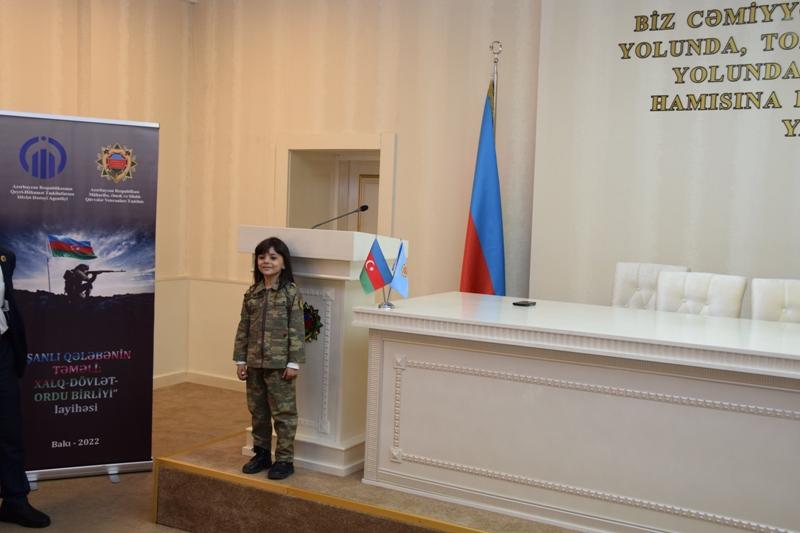 Mayın 13-də Azərbaycan Respublikasının Qeyri-Hökumət Təşkilatlarına Dövlət Dəstəyi Agentliyinin maliyyə dəstəyi ilə “Şanlı qələbənin təməli: xalq-dövlət-ordu birliyi” layihəsi çərçivəsində Müharibə, Əmək və Silahlı Qüvvələr Veteranları Təşkilatında növbəti tədbir keçirilib. Tədbirdə məktəblilər, QHT təmsilçiləri, media nümayəndələri, şəhid ailələri və veteranlar iuştirak edib.