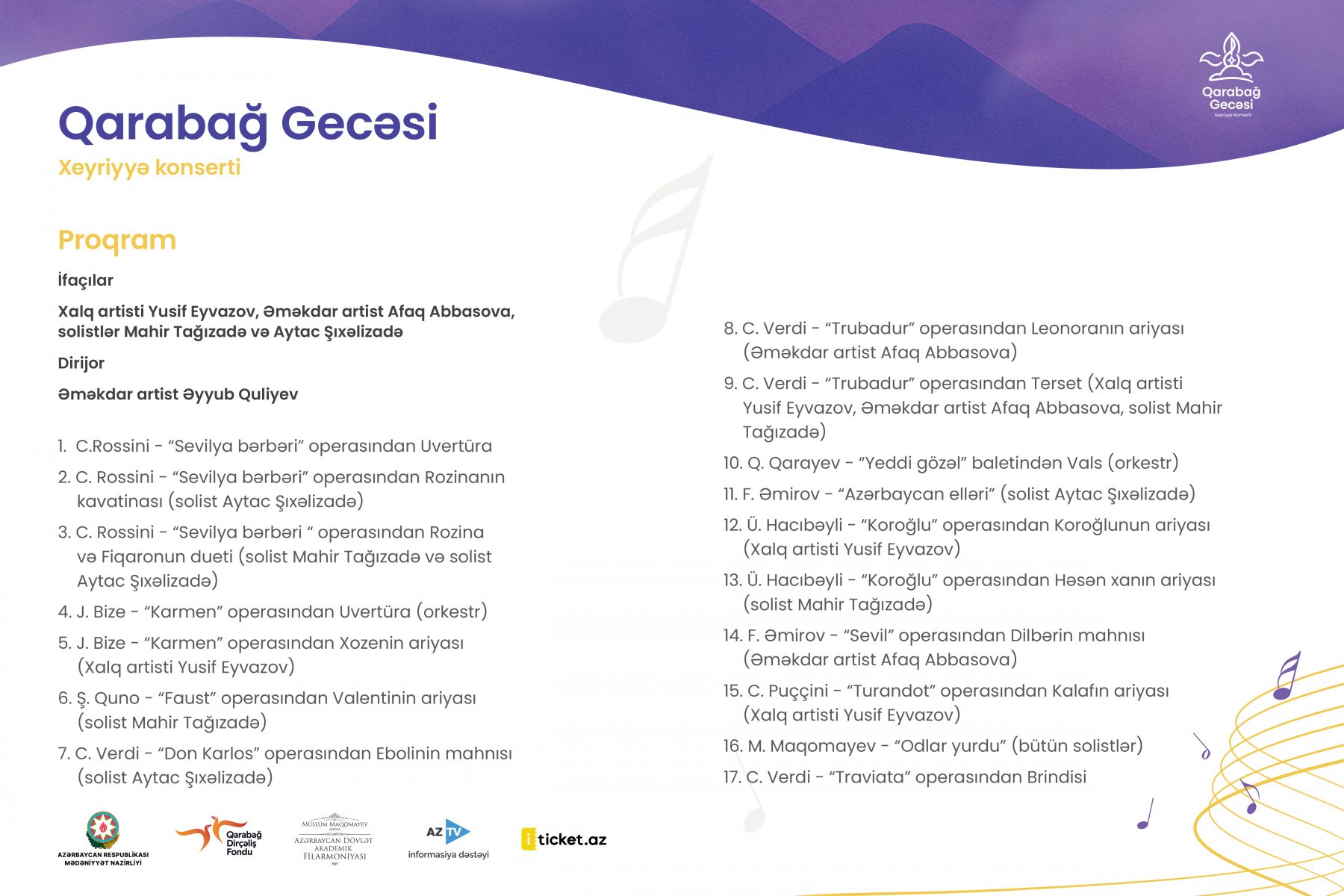 Bilet əldə etmək, eyni zamanda konsertin proqramı ilə tanış olmaq üçün linkə keçid edin: https://iticket.az/events/concerts/karabakh-night-charity-concert010/157313