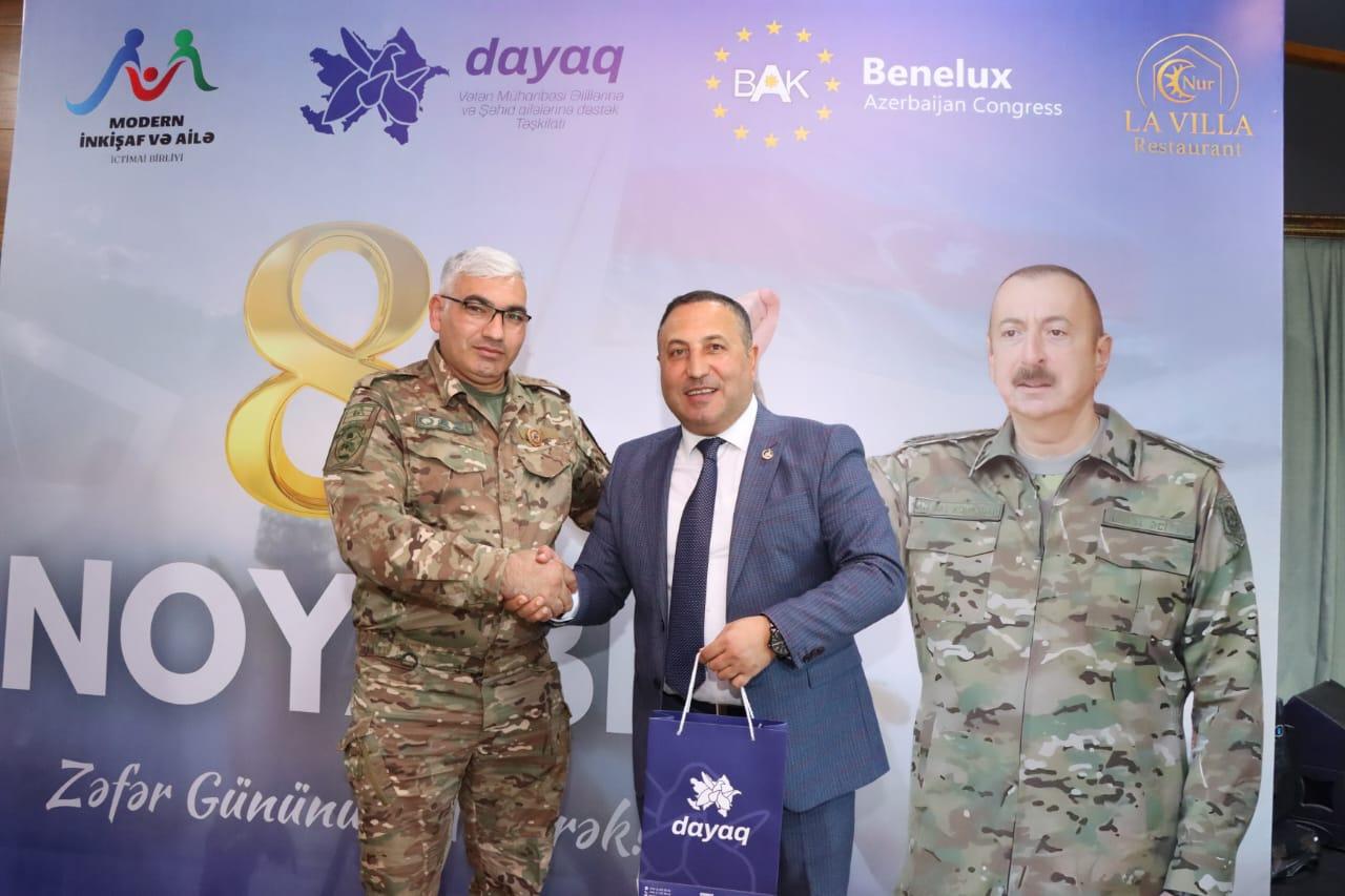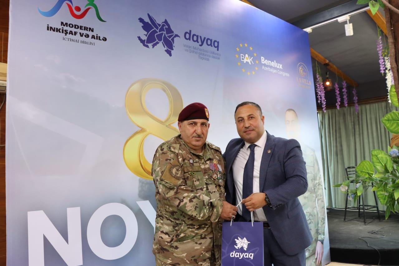 “8 noyabr Zəfər Bayramı” ilə əlaqədar olaraq 70-ə yaxın müharibə əlil və veteranlarına ziyafət verilib. Tədbir “Dayaq” Vətən Müharibəsi Əlillərinə və Şəhid Ailələrinə Dəstək Təşkilatı tərəfindən həyata keçirilib.