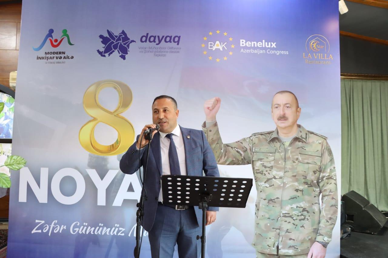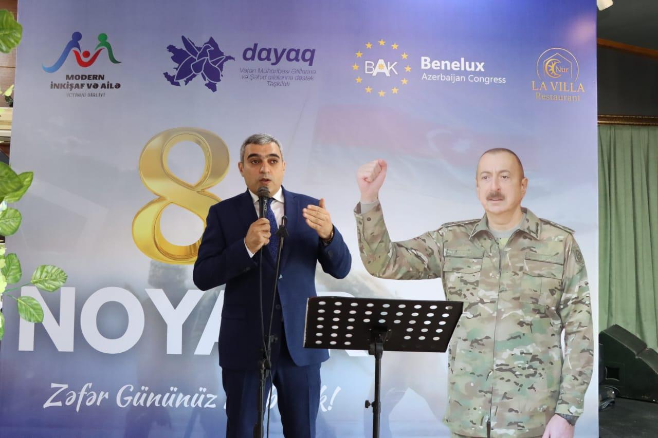 Tədbiri Dayaq təşkilatının sədr müavini Məcid Məmmədov açaraq qeyd etmişdir ki, bu gün biz müstəqil Azərbaycanın ən şanlı, ən qürurlu səhifələrindən birini – 8 Noyabr Zəfər Gününü böyük fəxarət və iftixarla qeyd edirik! Bu gün tariximizin qızıl hərflərlə yazıldığı gündür. Bu gün — xalqımızın 30 illik nisgilinə, işğal acısına son qoyulduğu, torpaqlarımızın azad edildiyi, ədalətin bərpa olunduğu gündür! Azərbaycan Ordusunun, Müzəffər Ali Baş Komandanımızın rəhbərliyi altında xalqımızın birliyi, igid oğullarımızın qəhrəmanlığı nəticəsində 44 günlük Vətən müharibəsində parlaq qələbə qazandıq. Şuşanın azad olunması ilə bu qələbə zirvəyə çatdı, düşmən ordusu darmadağın edildi, üçrəngli bayrağımız yenidən Qarabağ səmasında ucaldı. Bu zəfər təkcə bir hərbi qələbə deyil. Bu zəfər xalqın birliyinin, dövlətin gücünün, vətən sevgisinin təntənəsidir.