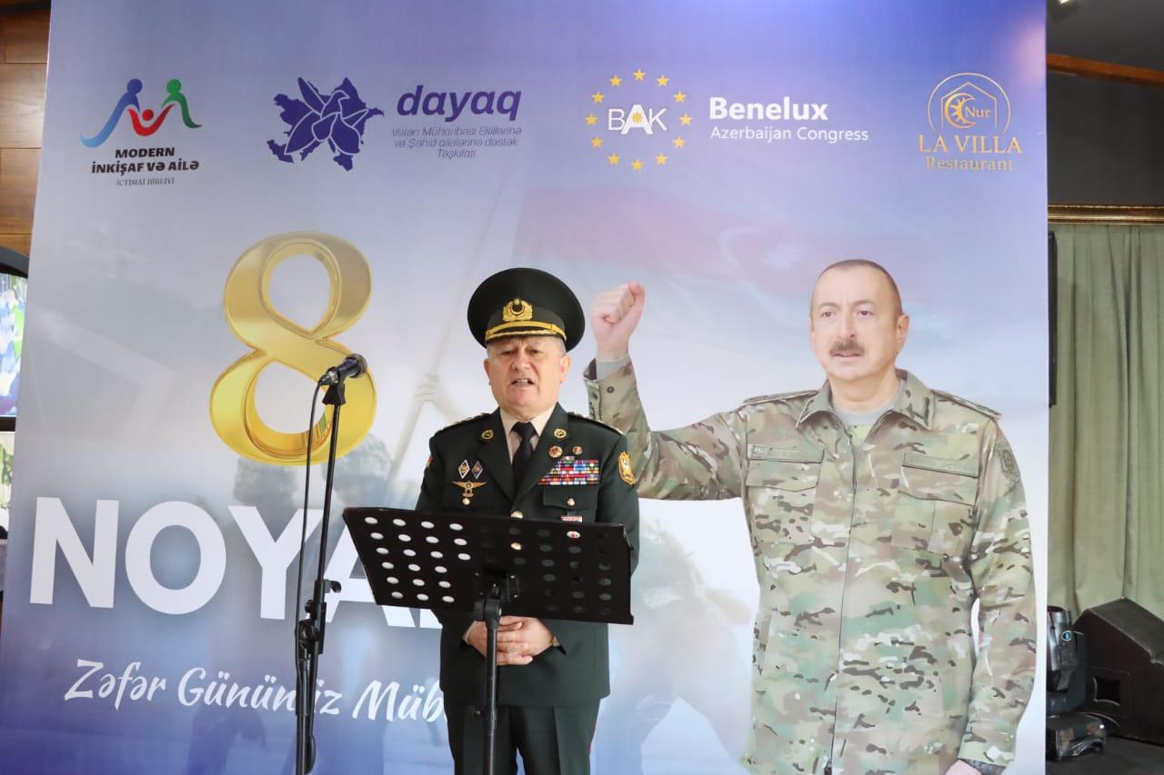 Müharibə, Əmək və Silahlı Qüvvələr Veteranları təşkilatının sədri Polkovnik Cəlil Xəlilov çıxış edərək qeyd etdi ki, Bu gün biz Azərbaycanın ən şanlı, ən qürurlu günlərindən biri – 8 Noyabr Zəfər Gününü böyük iftixar hissi ilə qeyd edirik!